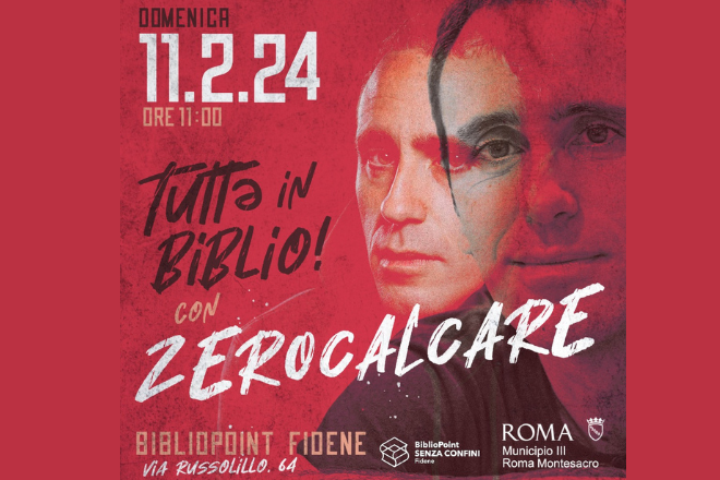 Domenica 11 febbraio 2024 alle ore 11  presso il Bibliopoint di Fidene, in Via Russolillo 64,  si svolgerà il primo appuntamento  dell’iniziativa “Tutti in Biblio!” organizzato dal Municipio Roma III presso il Bibliopoint: sarà presente Zerocalcare, Vi aspettiamo numerosi!