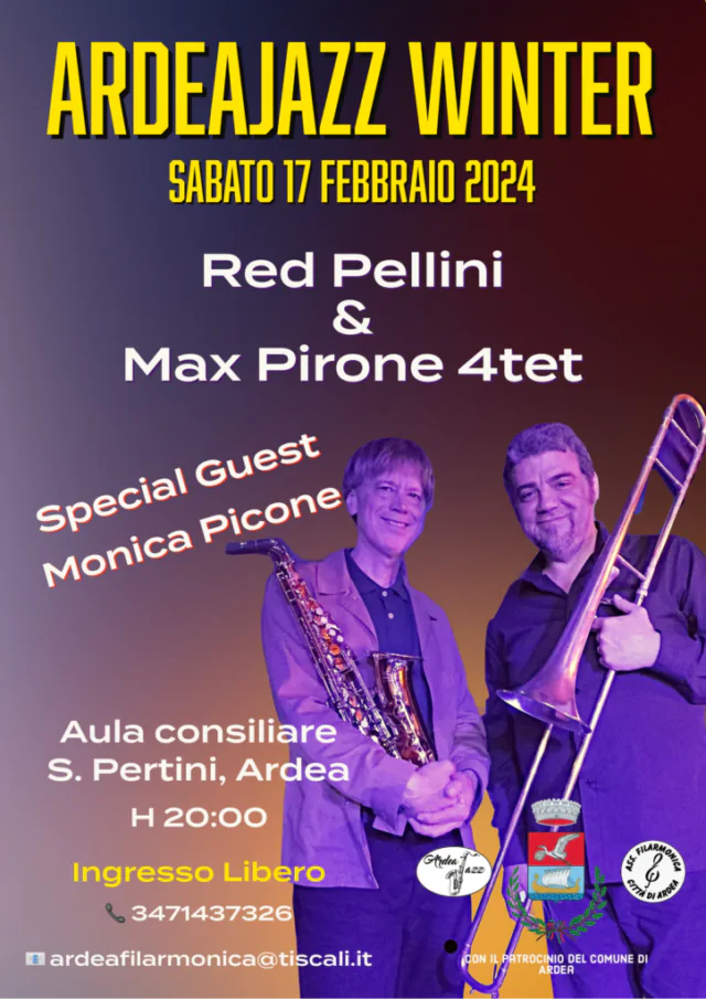 L’evento è stato organizzato dall’Associazione Filarmonica di Ardea con il patrocinio del comune di Ardea. Il concerto prevede la partecipazione del sassofonista Red Pellini e del trombonista Massimo Pirone. La serata li vedrà esibirsi con Claudio Colasazza al piano e Carlo Battisti alla batteria; Special Guest Monica Picone, vocalist dotata di una timbrica sensuale, di una vocalità flessuosa e una spiccata musicalità. Il Red Pellini & Max Pirone 4tet è nato dalla collaborazione trentennale dei due musicisti che presenteranno un programma molto vario con i più accattivanti brani tratti dal repertorio jazz e swing. Red Pellini, sassofonista arrangiatore e direttore d’orchestra ha collaborato con nomi di rilievo internazionali: Tony Scott, Carlo Loffredo, Renzo Arbore, Bob Wilber; Massimo Pirone trombonista, vanta collaborazioni con Enrico Pierannunzi, Paolo Fresu, Enrico Rava, Rosario Giuliani, Fabrizio Bosso, Danilo Rea. Entrambi, affiancati dagli altri musicisti della band, hanno deciso di proporre all’attento pubblico di Ardea, un concerto dalle pure sonorità del jazz tradizionale, fino ad arrivare alle coinvolgenti note dello swing, attraversando il periodo che va dagli anni 20 agli anni 40 con energia e coinvolgimento.