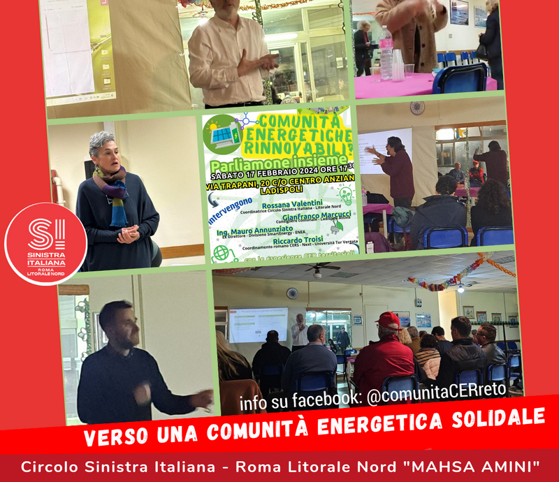 Lo scorso dicembre, il governo ha approvato un decreto per le comunità energetiche rinnovabili, e rimaniamo in attesa della regolamentazione, in uscita nelle prossime settimane. Il circolo di Sinistra Italiana Litorale Nord, insieme a Ladispoli Attiva, per l’occasione hanno organizzato, lo scorso 17 febbraio, un incontro con i cittadini che si è svolto nel Centro Sociale per la Terza Età di Ladispoli. “L’interesse ed il riscontro dei residenti – affermano dal Circolo Sinistra Italiana Litorale Nord “Mahsa Amini” – soprattutto del quartiere Cerreto, da anni riempiti di promesse elettorali con la metanizzazione – mai avvenuta – hanno compreso le grosse potenzialità di questo progetto che vogliamo “importare” su Ladispoli. Grazie all’Ing. Annunziato (Enea) e Riccardo Troisi (Next – Università Tor Vergata), sono state snocciolate difficoltà e soluzioni per la costituzione di queste comunità. Le CERS, di cui la S sta per solidale, offre la possibilità di reinvestire in servizi per la comunità, tutti gli introiti ed i risparmi ottenuti dalla condivisione di energia elettrica: un motivo in più per fare conoscere anche questa prospettiva e le molteplici possibilità di risparmiare e fare qualcosa per la propria città ed i suoi cittadini. Dispiace venire a conoscenza che le sigle politiche presenti tra gli organizzatori, non siano piaciute ad alcuni collaboratori del sindaco, che avrebbero preferito annullare l’evento. Le divergenze politiche, dinanzi ad un progetto solidale, non dovrebbero esserci. Come forza politica di sinistra, per noi è naturale rapportarci prima con i cittadini, poi con le istituzioni: rappresentiamo una larga percentuale di ladispolani che si sentono tagliati fuori da ogni decisione, perfino discussione. Ci saranno altre occasioni, per coinvolgere l’amministrazione: era fondamentale far conoscere il progetto ai cittadini, perché hanno una possibilità di “fare comunità”, risparmiare sulle bollette, migliorare la città. Al momento, non abbiamo visto un interesse da parte di questo comune, di politiche green o quantomeno, come cittadini, non ne siamo stati informati. Avete mica novità?”.