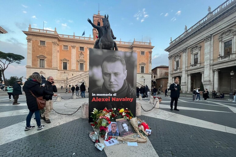 Una gigantografia con la foto del dissidente russo morto in carcere e la scritta: ‘In memoria di Alex Navalny’. Questa l’immagine posta davanti la statua del Marco Aurelio, in piazza del Campidoglio, dove tra poco partirà la manifestazione per rendere omaggio al dissidente russo. Sotto la foto di Navalny anche fiori, candele e diversi messaggi: ‘Ucciso da Putin. Ucciso ma non piegato’, recita una frase scritta a mano su un cartello.