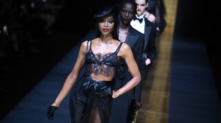 Signore e signori: Naomi Campbell. L’unica e irraggiungibile regina delle passerelle di tutto il mondo è sempre lei. Capelli corvini lunghissimi, falcata da pantera, la Venere nera, 53 anni, ha chiuso con il suo fascino e la sua sensualità insuperabili la sfilata di Dolce&Gabbana dedicata alla collezione donna per l’autunno inverno 2024-2025, tra gli eventi più attesi di questa Milano Fashion Week. Naomi è letteralmente apparsa in passerella creando silenzio in sala. Look total black: reggiseno nero di pizzo chantilly con fiocchi in raso, culotte sotto una gonna di chiffon, guantini in seta, coppola con veletta e scarpe slingback dai tacchi vertiginosi. Protagonista della collezione, dove ogni pezzo è un’ode alla femminilità, è la giacca tuxedo.