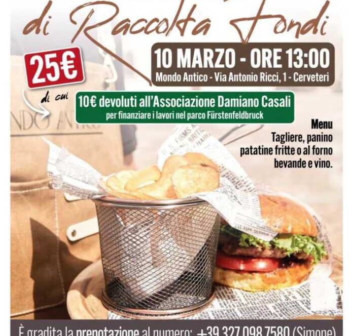 Primo evento pubblico a Cerveteri per l’”Associazione Damiano Casali – la Ferita e la Luce”, la Aps fondata ai fratelli e dagli amici di Damiano Casali, il 19enne di Cerveteri venuto a mancare in circostanze drammatiche nel novembre scorso. Come noto, da alcuni giorni la Aps ha preso in custodia, a seguito della firma del Patto di Collaborazione con il Comune di Cerveteri, la gestione del Parco Fürstenfeldbruck, un’area verde del territorio che una volta riqualificata intendono dedicare proprio alla memoria del giovane scomparso. Per dare seguito ai lavori e alle varie attività di riqualificazione, che saranno in ogni caso eseguite sempre sotto la supervisione del Comune di Cerveteri, l’Associazione Damiano Casali promuove un pranzo di raccolta fondi, che si terrà domenica 10 marzo presso l’attività “Mondo Antico”, sita in Via Antonio Ricci n.1, adiacente Piazza Aldo Moro. Il costo del pranzo è di €25, di cui 10 saranno devoluti all’Associazione. Il menù è estremamente vario: tagliere, panino, patatine fritte o al forno, bevande e vino. Per informazioni e prenotazioni, contattare il numero 3270987580