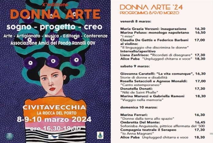 Dall’8 al 10 marzo alla Rocca del porto le artiste di Donna Arte, in collaborazione con gli Amici del Fondo Ranalli, daranno vita alla mostra di artigianato e d’arte e ad una serie di performance culturali. In tutto 28 espositrici tra pittrici, decorative, artigiane del cuoio, cucito, sartoria, ceramica, monili, orafe e ricamatrici di Civitavecchia e del comprensorio arricchiranno con le loro opere la suggestiva sede della Rocca. Negli stessi pomeriggi si susseguiranno presentazione di libri, performance teatrali, musica e conferenze a cura di ben 12 donne che metteranno a disposizione le loro conoscenze e capacità in uno spirito di condivisione e solidarietà. La manifestazione nata inizialmente con una esposizione all’interno della Galleria del libro di Civitavecchia è pian piano cresciuta arricchendosi e affermandosi come un appuntamento importante per le donne di tutto il territorio grazie anche al supporto delle istituzioni e, soprattutto, degli Amici del Fondo Ranalli. “Siamo giunte oramai alla 10° edizione di questa iniziativa e anche quest’anno possiamo offrire il quadro di una vitalità e di una creatività femminile davvero interessante. La Mostra sarà inaugurata venerdì 8 Marzo alle 16,30 e sarà visitabile fino a domenica anche la mattina dalle 10.00 alle 12,00 mentre nel pomeriggio si alterneranno gli interventi sui più diversi temi – afferma la presidente degli Amici del Fondo Ranalli Maria Grazia Verzani –. Devo ringraziare Mara Prezioso vicepresidente dell’Associazione per il supporto organizzativo e per la professionalità con cui ha seguito tutta l’organizzazione insieme a Ornella Sorice e tutte le donne che hanno partecipato. Trenta donne che mettono a disposizione la loro arte le loro capacità il loro sapere e il loro saper fare sono davvero una ricchezza per il territorio.
