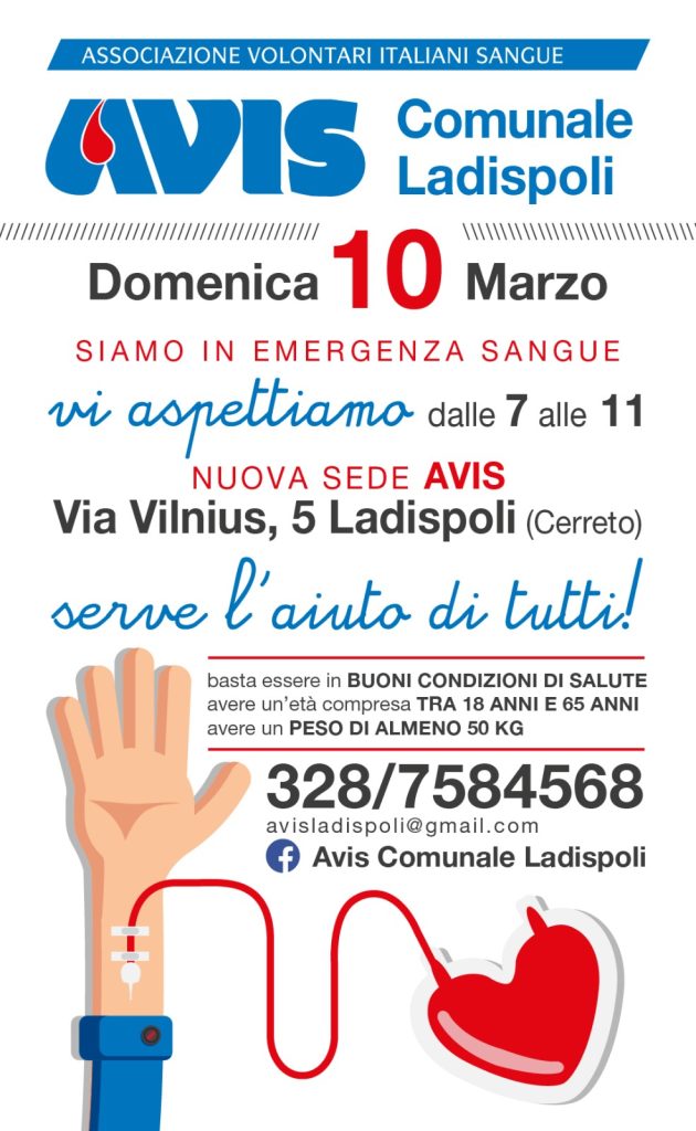 agli ambiziosi obiettivi di raccolta che si è posta per il 2024. La prossima raccolta è prevista per domenica 10 marzo, sempre nella sede di Ladispoli in via Vilnius, 5. La squadra dei volontari AVIS vi accoglierà, con la loro proverbiale efficienza e cordialità, dalle ore 7:00 alle ore 11:00. Per prenotarsi, telefonare al numero: 328-7584568.