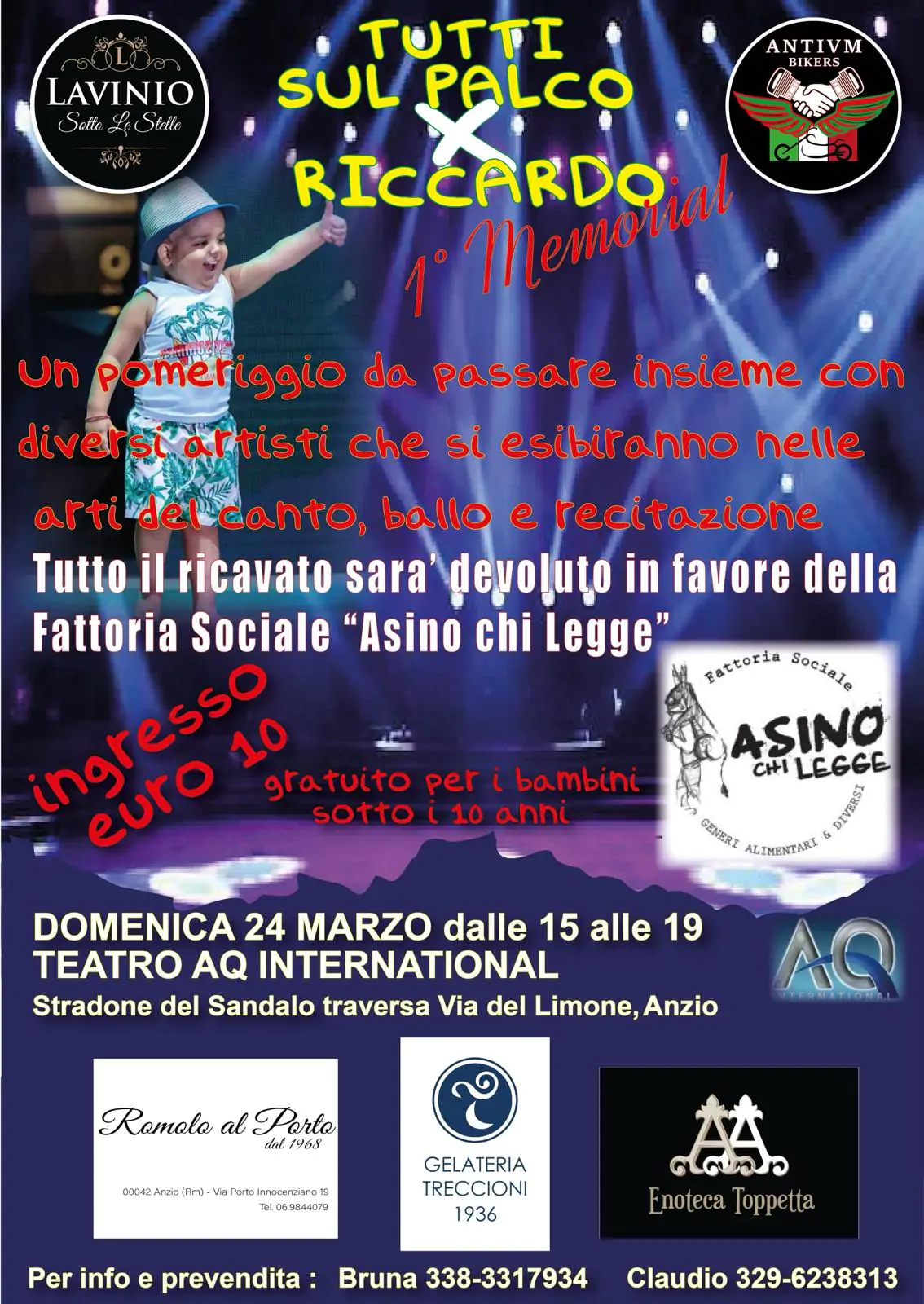 Il 24 marzo, dalle 15 alle 19, presso la Sala AQ INTERNATIONAL di Via del Limone, in località Sacida in Anzio si terrà l’evento “Tutti sul palco per Riccardo – I° Memorial”. Sarà un susseguirsi di tanti artisti che si cimenteranno, da solisti o in gruppo, in canti, balli e recitazioni. “Teniamo a precisare che non è una gara quindi non c’è nessun vincitore, ma vincerà la solidarietà di coloro che assisteranno all’evento acquistanto il biglietto d’ingresso a 10 euro (l’ingresso è gratuito per bambini fino a 10 anni).