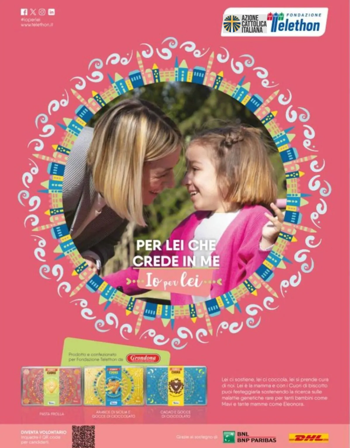 L’Azione Cattolica è di nuovo al fianco della fondazione Telethon per la campagna di primavera 2024 che si svolgerà sabato 4 e domenica 5 maggio nelle piazze e nelle parrocchie di tutta Italia, in cui verranno distribuiti cuori e cuoricini di biscotto, con l’obiettivo di raccogliere fondi per sostenere la ricerca sulle malattie genetiche rare. I volontari dell’associazione parrocchiale di Falasche, come già accaduto negli anni precedenti, saranno presenti per sostenere l’iniziativa della fondazione con un banchetto Telethon che verrà allestito dinanzi alla parrocchia di Sant’Antonio Abate nei giorni di sabato 4 e domenica 5 maggio per distribuire i cuori di biscotto nelle varianti arance di Sicilia con gocce di cioccolato con pasta frolla e cacao con gocce di cioccolato da distribuire a fronte di una donazione minima di 15 euro e cuoricini di biscotto al cacao da distribuire a fronte di una donazione minima di 6 euro.