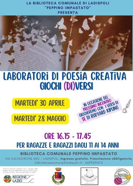 L’amministrazione comunale informa che in Biblioteca tornano i Giochi (di)versi – Laboratori di poesia creativa, dedicati ai ragazzi e ragazze dagli 11 ai 14 anni che potranno mettersi in gioco con un’officina poetica. Dopo il successo del primo appuntamento con Giacomo Leopardi, martedì 30 aprile dalle 16.15 alle 17.45, è la volta di Rudyard Kipling con la poesia SE Partendo dalla lettura dell’albo illustrato dedicato a questa poesia e seguendo il flusso delle idee e sensazioni provate, ognuno procederà alla creazione di un nuovo e originale componimento, ispirato a quanto visto e ascoltato. Successivamente i ragazzi agiranno come dei veri “poeteppisti”: diffonderanno la propria opera e alcuni versi dell’autore tra le sale della biblioteca, fornendo ad altri utenti l’opportunità di imbattersi nella bellezza della poesia. Il progetto è curato dall’Associazione Aperta Parentesi ed è realizzato con il sostegno della Regione Lazio per Biblioteche, Musei e Archivi – Piano annuale 2023, L.R. 24/2019. L’evento, inserito nel Programma del Maggio dei Libri della Biblioteca di Ladispoli, si terrà in Sala Conferenze; la partecipazione è libera e gratuita con prenotazione obbligatoria ai contatti della Biblioteca.