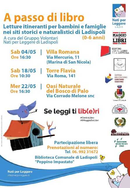 L’amministrazione comunale informa che la Biblioteca, in occasione del Maggio dei Libri, è lieta di presentarvi A passo di libro, letture itineranti per bambini e famiglie nei siti storici e naturalistici della nostra città. Si tratta di 3 appuntamenti di lettura per bambini da 0 a 6 anni, a cura del nostro instancabile Gruppo Volontari Nati per Leggere di Ladispoli, che si svolgeranno nelle seguenti giornate: Sabato 04/05 alle ore 16:30, presso la Villa Romana di San Nicola, Via Mercurio 11. Sabato 18/05 alle ore 10:30, a Torre Flavia, ingresso di Via Roma 141. Mercoledì 22/05 alle ore 16:30, al Bosco di Palo, Via Corrado Melone snc. Gli eventi sono ad ingresso libero e gratuito con prenotazione ai contatti della Biblioteca. E’ consigliabile portare un telo o un asciugamano per far sedere comodamente i bambini.