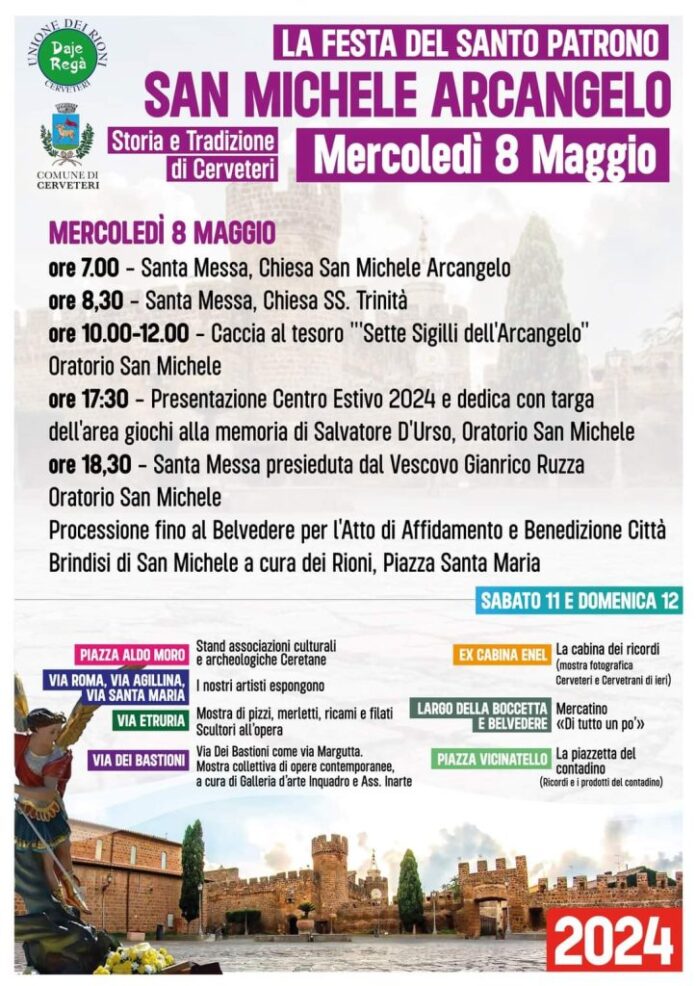 Oggi Cerveteri festeggia il Santo Patrono, San Michele Arcangelo. Per tutto il fine settimana, da venerdì 10 a domenica 12 maggio, la città si prepara ad accogliere la sua Festa del Patrono, celebrando la devozione a San Michele Arcangelo. Tradizione e storia si intrecciano in un programma ricco di eventi, dai festeggiamenti religiosi ai giochi popolari, dall’ enogastronomia agli spettacoli dal vivo per grandi e piccoli. Musica, arte, mostre e artigianato animeranno le vie del centro storico, creando un’atmosfera festosa e coinvolgente. La Festa del Patrono è un’occasione imperdibile per immergersi nella bellezza e nella cultura di Cerveteri. L’assessore alla cultura Federica Battafarano rivolge un ringraziamento speciale ai Rioni di Cerveteri per la passione e l’impegno profuso!