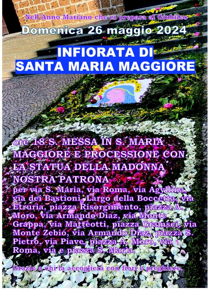 Il mese di maggio è tradizione in Italia festeggiare il Corpus Domini, per questa festa cattolica, ancora molto sentita in Italia e nel Lazio si è soliti festeggiare con la famosa “infiorata” una manifestazione consistente nel realizzare tappeti per mezzo di fiori o parti di essi. Cerveteri come ogni anno festeggia questo atteso evento, domenica 26 maggio ci sarà la tradizionale “Infiorata di Santa Maria Maggiore” alle ore 18:00 è prevista la celebrazione della Santa Messa e a seguire la processione religiosa con la statua della Madonna. L’itinerario sarà : Via Santa Maria, via Roma, via Agyllina, via dei Bastioni, Largo della Boccetta, via Etruria, piazza Risorgimento, Piazza Aldo Moro, via Armando Diaz, via Monte Grappa, via Matteotti, piazza Gramsci, via Monte Zebio, Via Armando Diaz, piazza San Pietro, via Piave, piazza Aldo Moro e ritorno in Piazza Santa Maria.