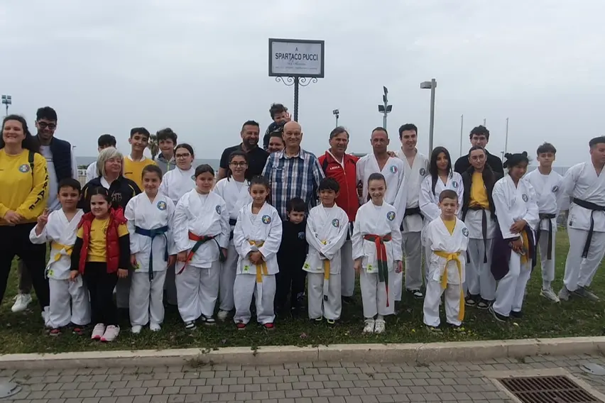 Con una bella cerimonia svoltasi domenica mattina è stata scoperta una targa in onore di un grande uomo di sport, Spartaco Pucci. Il riconoscimento, deliberato dall’Amministrazione comunale, racchiude nelle parole scritte nella targa una vita dedicata alla pratica ed alla diffusione delle attività sportive in un’Italia appena uscita dalla seconda guerra mondiale: “A Spartaco Pucci, fra i pionieri dello sport civitavecchiese”. Significativo è anche il luogo dove è stata posta la targa e cioè nella parte della marina antistante la piscina di Largo Caprera che, lo stesso Spartaco nel 1949 con altri 12 soci fondatori, ideò e finazio di tasca propria. «In una Civitavecchia bombardata ed uscita distrutta dalla guerra – commenta il figlio Stefano Pucci – era una “avventura” parlare di sport; la gente non aveva neanche le scarpe e lottava solo per riuscire a mangiare. A quei tempi, nella nostra città, esistevano solo due sport; il calcio ed il pugilato. Mio padre fa parte di quei pionieri che piantarono i semi di quella mentalità sportiva che, nei decenni successivi, ha portato gloria alla nostra piccola città, su tutti gli stadi, i palazzetti e le piscine del mondo». La cerimonia è stata presenziata dal Presidente del Consiglio comunale Giancarlo Frascarelli, che ha scoperto la targa, e dall’attuale Presidente della Meiji Kan karate Stefano Pucci; presenti gli atleti della società di Via Terme di Traiano con tanti genitori ed amici intervenuti in segno di rispetto. Spartaco Pucci è stato un buon pugile dilettante tra il 1944 ed il 1947, fu corrispondente per l’Italia della famosa rivista americana Boxe Ring. Giocatore, capitano, bomber ed allenatore della pallanuoto civitavecchiese quando si giocava ancora al pirgo e veniva chiamata rugby marino; nel 1950 fondo la SNC Civitavecchia, dove gioco dal 1948 al 1957. Fu, negli anni ’60/’70, uno dei migliori arbitri di serie A ed internazionali di pallanuoto; socio fondatore nel 1977 della Meiji Kan Karate di cui fu Presidente per 30 anni fino alla sua morte. Il CONI gli ha tributato, nel 1999, la stella d’onore al merito sportivo.