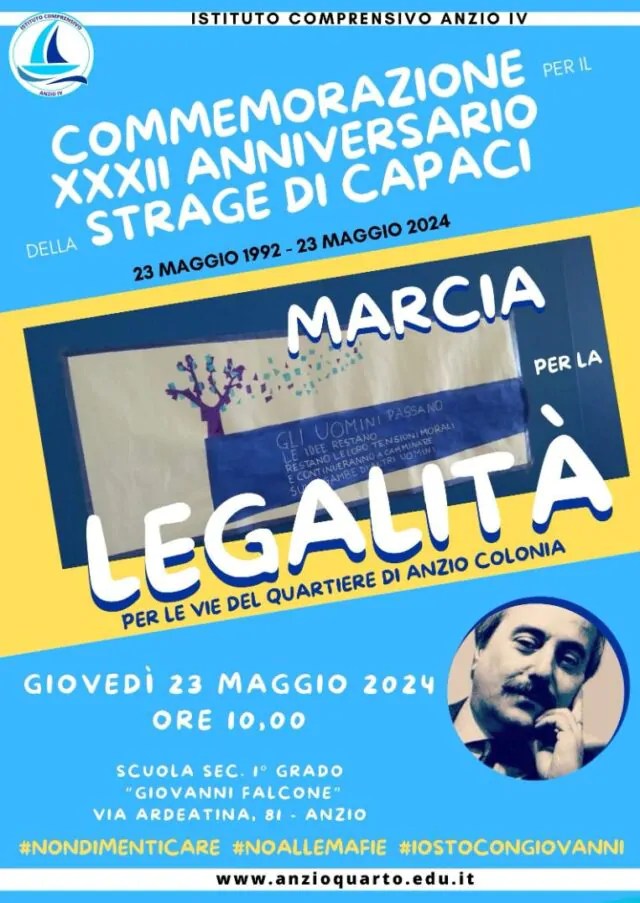 Nella giornata di domani, giovedì 23 maggio, alle 10 si terrà la cerimonia commemorativa per il 32° anniversario della morte del giudice Giovanni Falcone presso la sede centrale dell’Istituto Comprensivo Anzio IV in via Ardeatina n. 81. Durante la manifestazione verrà inaugurata la nuova intestazione dell’istituto scolastico donata dall’Associazione Antium XXIX. Successivamente è prevista la Marcia della Legalità per le strade del quartiere.