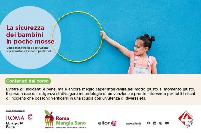 L’iniziativa denominata “La sicurezza dei bambini in poche mosse” è organizzata dalla Elior Ristorazione e consiste in una serie di incontri tra maggio e giugno 2024 presso alcune scuole dell’infanzia del Municipio IV rivolti alle insegnanti, alle educatrici e alle famiglie interessate. Primo appuntamento il 27 maggio, dalle 17 alle 19, presso la Scuola dell’infanzia Grotta di Gregna in via A. Mammuccari. Ciascuna giornata di corso potrà ospitare 36 persone e verranno affrontati i temi di: prevenzione e sicurezza a nanna, a scuola, a casa e in auto; la chiamata di emergenza; le manovre di disostruzione.