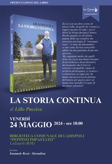 La Biblioteca comunale di Ladispoli invita, venerdì 24 maggio alle ore 18:00, alla presentazione del nuovo libro di Rosolino (Lillo) Puccica dal titolo “La storia continua”, edito da La Caravella. “Mister Lillo”, come lo chiamano nell’ambiente calcistico, è uno di quelli che non hanno bisogno di un’etichetta o di un distintivo che ne attestino i risultati sportivi; egli, infatti, nonostante abbia calpestato l’erba degli stadi di tutta Italia allenando squadre di serie C e D, lo si trova sempre in oratorio o in qualche campo di periferia ad insegnare, a credere e scommettere su ragazzini che hanno ancora accesa la fiamma dell’amore per il calcio. L’evento si terrà nella Sala Conferenze della Biblioteca e verrà moderato dal giornalista Emanuele Rossi; al termine del dibattito, l’autore si intratterrà con il pubblico per il firmacopie.