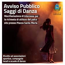 https://www.comune.cerveteri.rm.it/novita/saggi-di-danza-2024-manifestazione-di-interesse-allutilizzo-del-palco La rassegna, che si terrà dal 24 giugno al 6 luglio 2024, rappresenta un’importante iniziativa volta a sostenere le attività delle associazioni sportive, delle compagnie locali e delle scuole di danza del territorio. L’obiettivo è quello di garantire una gestione equa e trasparente degli spazi disponibili, promuovendo le eccellenze culturali e sportive del proprio territorio e favorendo, al contempo, una programmazione condivisa tra le diverse realtà partecipanti.