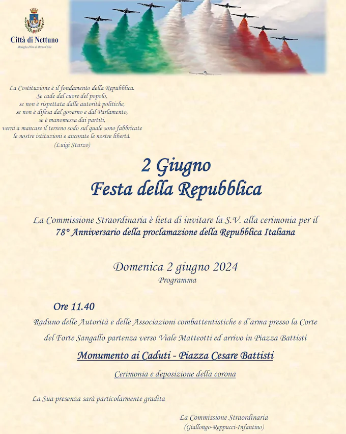 Oggi 2 Giugno, La Commissione Straordinaria del Comune di Nettuno, invita tutti i cittadini alla cerimonia per il 78° Anniversario della proclamazione della Repubblica Italiana.
