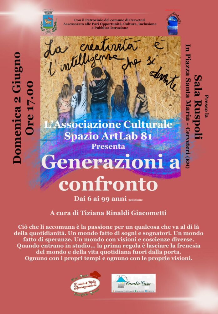 Presso la Sala Ruspoli in Piazza Santa Maria a Cerveteri, si terrà una mostra d’arte curata dalla professoressa Tiziana Rinaldi Giacometti, che esporrà le opere dei suoi allievi. L’evento, giunto ormai alla terza edizione, è organizzato dall’Associazione Culturale Spazio ArtLab 81 e si intitola “Generazioni a confronto” e coinvolgerà partecipanti dai 6 ai 99 anni. Un evento intergenerazionale che porta alla luce la creatività, la passione e la visione di ogni individuo.