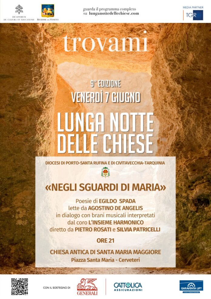 Le diocesi di Porto-Santa Rufina e di Civitavecchia-Tarquinia partecipano alla nona edizione della “Lunga notte delle chiese” con l’evento “Negli sguardi di Maria”, che si terrà il 7 giugno alle 21 nella chiesa antica di Santa Maria maggiore in piazza Santa Maria a Cerveteri. L’ingresso è libero. “Lunga notte della Chiese” è una manifestazione di rilievo nazionale che coinvolge diocesi, parrocchie e associazioni nell’organizzazione di una giornata in cui i luoghi si animano di iniziative artistiche e culturali in una chiave di riflessione e spiritualità. Il tema di quest’anno è «Trovami!». L’evento proposto dalle due Chiese unite nella persona del vescovo Gianrico Ruzza rientra nelle iniziative per l’Anno Mariano che sta vivendo la diocesi di Porto-Santa Rufina. La figura della Madonna viene proposta nel dialogo tra le poesie di Egildo Spada, lette da Agostino De Angelis, e brani della tradizione musicale classica interpretati dal coro “l’Insieme Harmonico” diretto da Pietro Rosati e Silvia Patricelli. Le parole di Spada, tratte dalla raccolta “Etere d’inverno”, edita da Fuorilinea, fanno parte della sezione “Per Maria”. Il poeta percorre alcune “stanze” nelle quali osserva e racconta il cuore e la fede di Maria attraverso la storia del figlio Gesù. Per lei il mistero va contemplato e testimoniato oltre ogni dubbio e ogni dramma. Ed è nei suoi silenzi che l’arte si fa preghiera perché riesce a custodire l’inesauribile pienezza del sacro offrendo sempre nuove interpretazioni che aiutano gli uomini di ogni tempo ad entrare in relazione con il divino. Arte e preghiera consentono infatti di trovare Dio e gli altri in un incontro tra creatore e creature. Il dialogo tra loro genera la possibilità di vivere un’esperienza spirituale e artistica: contemplare la bellezza della verità.