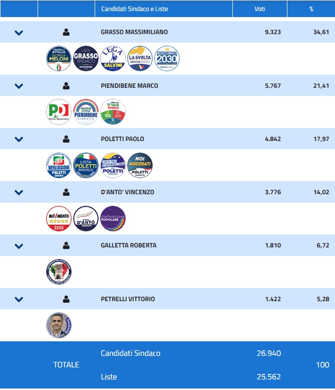 Con tutte le 53 sezioni scrutinate, almeno per quel che riguarda i candidati sindaci, il dato è inconfutabile: sarà ballottaggio tra l’editore e giornalista Massimiliano Grasso e Marco Piendibene. Il distacco tra le due coalizioni supera i 13 punti percentuali. “E ci siamo, abbiamo tutti insieme raggiunto il nostro primo obiettivo: il ballottaggio”. Così Grasso in un post social. “Ringrazio i cittadini per questo risultato, tutti quelli che hanno lavorato per queste elezioni, di qualsiasi schieramento e con qualsiasi ruolo. La democrazia è questa: energia che produce rinnovamento. Da domani si riparte con entusiasmo ancora maggiore a spiegare anche a chi non ci ha votato al primo turno, soprattutto a chi ha deciso di non votare nel primo turno, la nostra idea di città. Sono certo che il nostro progetto di governo interpreti al meglio i sogni e i bisogni della nostra comunità. Andiamo avanti con Civitavecchia nel cuore; andiamo avanti perché vince Civitavecchia”. “Il ballottaggio? Sicuramente un obiettivo a cui tendevamo – ha spiegato Piendibene – abbiamo dato il massimo, lavorato dure per questo risultato, promuovendo tanti incontri con i cittadini e spiegando, anche e soprattutto nei confronti pubblici con gli altri candidati, il senso del nostro progetto. In queste due settimane lavoreremo per colmare il gap con Grasso”.