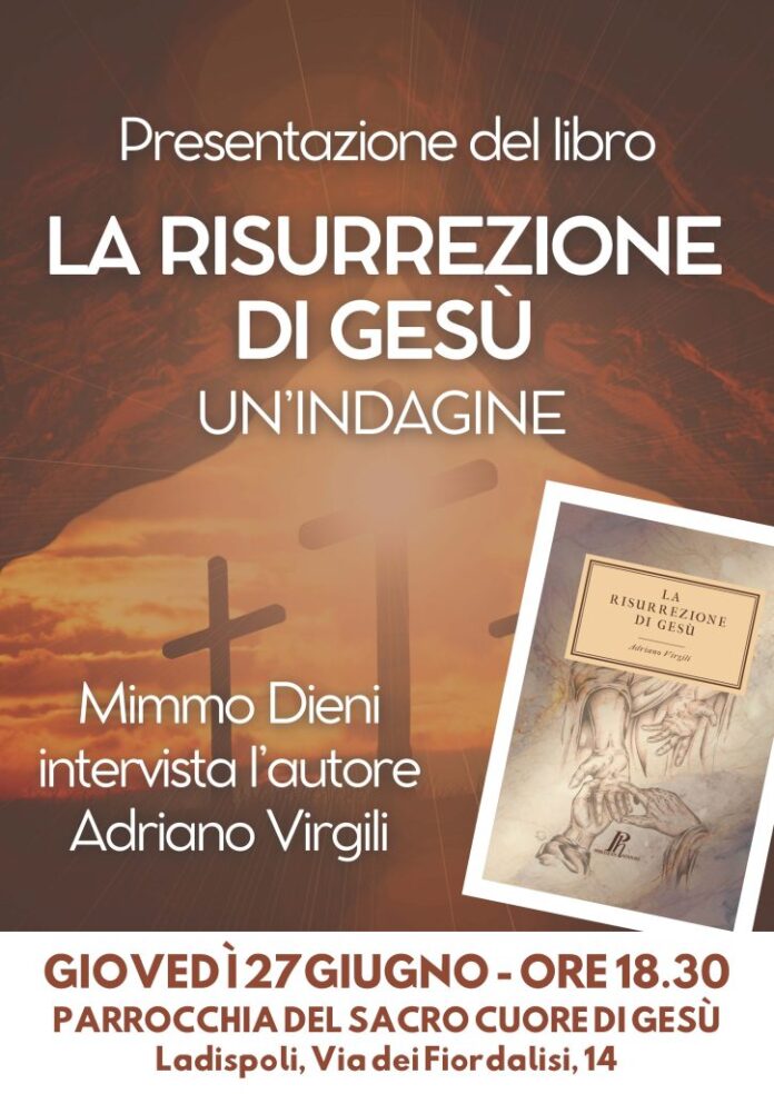 Il libro di Adriano Virgili, edito da Phronesis, è un piccolo trattato multidisciplinare, con argomenti storici, teologici e filosofici, espressi con concetti e linguaggio semplice e comprensibile anche dai “non addetti ai lavori”. Una ricerca storica che prende in esame tutte le teorie e spiegazioni possibili, riguardo la resurrezione di Gesù di Nazareth, per giungere, seguendo il metodo storico critico, alla soluzione che nel linguaggio accademico viene definita come la più “economica”, ovvero la più probabile. Un libro, per tutti, che parla di storia, teologia e filosofia, senza “invasioni di campo” ed in modo assolutamente obiettivo. Sarà presentato giovedì 27 giugno alle ore 18,30, a Ladispoli, presso la Parrocchia del Sacro Cuore di Gesù in Via dei Fiordalisi 14. Mimmo Dieni intervisterà l’autore che sarà a disposizione dell’uditorio per ogni domanda.