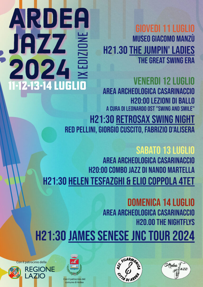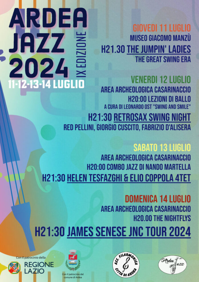 Ecco il programma della rassegna di concerti jazz nella città di Ardea per il prossimo mese di luglio. Si comincia l’11 luglio alle 21.30 al Museo Giacomo Manzù con il concerto The Jumpin Ladies. Si prosegue venerdì 12 luglio all’area archeologica Casarinaccio con l’esibizione di Retrosax Swing Night. Sabato 13 luglio sarà la volta di Helen Tesfazghi. I concerti si chiuderanno il 124 luglio con lo show del grande sassofonista napoletano James Senese-