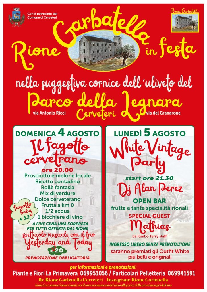 Il Rione Garbatella ha organizzato una due giorni di festa nella suggestiva cornice dell’oliveto del Parco della Legnara a Cerveteri. Il primo appuntamento è domenica 4 agosto è previsto il fagotto cervetrano: una cena accompagnata dallo spettacolo musicale del trio Yesterday and Today con prenotazione obbligatoria. Al termine della cena il Rione consegnerà un piccolo regalo a tutti i presenti. Lunedì 5 agosto si terrà invece il White Vintage Party con la partecipazione di Mathias del Kimbo Terry Staff. L’ingresso è gratuito.