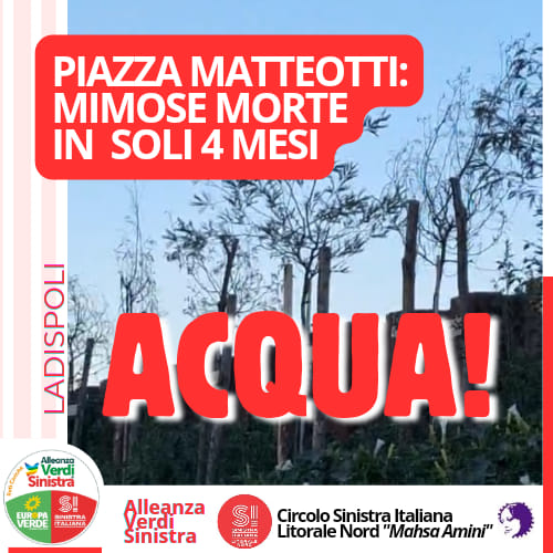 Riceviamo e pubblichiamo – A Piazza Matteotti, dopo mesi di lavori e transenne, sono stati piantumati circa 50 alberi di mimose lungo gli argini. In soli 4 mesi, gli alberi sono già secchi. Siccità ed emergenza climatica, insieme alla convinzione tipica del centrodestra che il verde pubblico si annaffi da solo e sopravviva, creano spesso questi disagi a Ladispoli.
