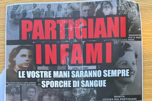 Sui manifesti è scritto: ‘Partigiani infami – Le vostre mani saranno sempre sporche di sangue’ sullo sfondo di foto in bianco e nero di donne, definite vittime dei partigiani.
