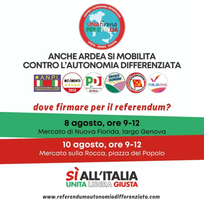 “Si tratta di una legge che di fatto rischia di spaccare il paese, consentendo alle aree più ricche e sviluppate di garantire livelli più elevati di servizi, anche grazie alla gestione diretta del gettito fiscale e cancellando meccanismi che consentono di ripartire i fondi sulla base delle effettive esigenze” sostengono le forze politiche e sociali della città rutula che promuovono l’iniziativa.“Il provvedimento non solo mina la solidarietà nazionale e l’unità del paese, ma per zone periferiche ed economicamente depresse come Ardea, del tutto carenti di servizi, equivale ad una vera e propria condanna, che rischia di impedire sul nascere qualsiasi possibilità di sviluppo”. Pur avendo raggiunto la quota necessaria a indire il referendum, la campagna continua, sia per consentire di raccogliere il maggior numero possibile di firme, sia per informare adeguatamente le persone. Per chi non potesse recarsi di persona ai banchetti dell’8 e del 10 agosto, è comunque possibile firmare online, con lo Spid, sul sito www.referendumautonomiadifferenziata.com dove sono riportate anche informazioni sulla legge e sui motivi per cui è necessario abrogarla. È possibile firmare ad Ardea, poi, anche ai banchetti organizzati dal Partito Democratico il 3 agosto a largo Genova (Nuova Florida) e il 5 agosto al mercato di Tor San Lorenzo oppure recandosi presso la sede Spi Cgil di via Rieti (zona Rio Verde) dal lunedì al venerdì, dalle 9 alle 13 e dalle 15 alle 17:30.