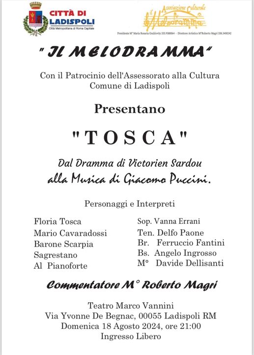 Ladispoli, il 18 agosto al Teatro Vannini Il Melodramma che presenta: Tosca. L’appuntamento è per domenica 18 agosto, ore 21. A renderlo il Comune della città balneare dal proprio profilo Facebook. Ingresso libero.
