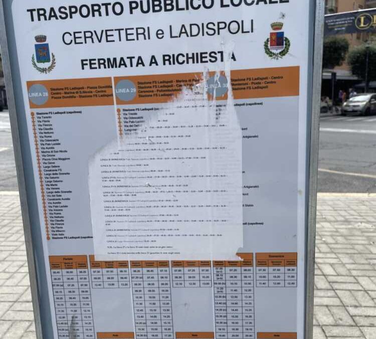 Critica severa da parte di Infompresa nei confronti del tpl e della raccolta rifiuti di Ladispoli. “Si possono aggiornare gli orari degli autobus locali attaccando sui cartelli istituzionali a colori una fotocopia in bianco e nero dei nuovi orari, fotocopia che copre solo in minima parte quelli precedenti, nascondendo invece i percorsi dei bus? Sì e succede a Ladispoli (Roma). Qui qualche genio ha pensato bene di rendere pubblici i nuovi orari dei bus, in vigore dallo scorso primo settembre, attaccando con la colla fotocopie dei nuovi orari direttamente sui cartelli (più grandi delle fotocopie) con su scritto gli orari precedenti. Naturalmente i nuovi fogli sono stati subito semi-strappati dal vandalo di turno, creando ulteriore disorientamento nell’utenza. Infatti non si comprende quali siano gli orari delle linee di autobus tra quelli vecchi, ancora ben visibili sui grandi cartelli a colori, e quelli nuovi, riportati su fotocopie semi-strappate. Anche il ricorso al web non è chiarificatore in quanto sono presenti vecchi e nuovi orari e, inoltre, non è facile individuare la fonte affidabile. Infine, tanto per gradire, se sulla cartellonistica viene indicato il numero verde dell’azienda Seatour (che gestisce il trasporto pubblico locale a Ladispoli e Cerveteri) per avere informazioni, si viene a scoprire che quel numero è disattivato da tempo. Meglio non va per la raccolta dei rifiuti. La società Tekneko, che gestisce il servizio a Ladispoli, fissa appuntamenti addirittura a 21 giorni per la raccolta rifiuti ingombranti a domicilio. E nella popolosa frazione di Marina di San Nicola manca un raccoglitore del genere, obbligando i cittadini a trasporti per diversi chilometri”.