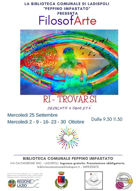 L’amministrazione comunale informa che tornano in Biblioteca gli incontri di Filosofarte: con Ri-Trovarsi… Storie in essere, si dà il via ad un percorso esperienziale dedicato alla pratica della Filosofia come Arte di essere Dalla Conoscenza di Sé alla Pratica di Vita. Vista la grande partecipazione e l’interesse riscontrato nei precedenti appuntamenti di Filosofarte, abbiamo deciso di aprire gli incontri a tutti i curiosi, di ogni età, che sentano interesse per la filosofia vissuta come opera “trasformattiva”, volta a nutrire la consapevolezza in relazione. Nelle storie di vita si esprime una melodia di sottofondo che tutto unisce: umanità. Nel sentire la vita con spirito spensierato, emergono rotte che guidano nella complessità della vita. Coinvolgendo le voci di opere artistiche e conoscenze filosofiche del panorama occidentale/orientale, Ri-trovarsi invita a partecipare, con spirito di meraviglia, accogliendo il valore della riflessione creativa unita al sentirsi, all’immaginazione, alla forza di volontà. Gli incontri si terranno tutti i mercoledì dal 25 settembre al 30 ottobre dalle 9:30 alle 11:30, con il seguente programma: