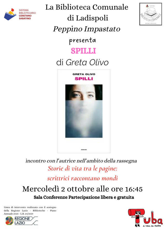Nuovo appuntamento di Storie di vita tra le pagine: scrittrici raccontano mondi, la nostra rassegna curata dalla Libreria Tuba, nata con l’intento di avvicinare gli utenti ai libri, proponendo incontri con alcune grandi scrittrici contemporanee. Mercoledì 2 ottobre alle ore 16:45, avremo ospite Greta Olivo che presenterà il suo romanzo d’esordio Spilli. Edito da Einaudi, il libro è stato uno dei finalisti del Premio Flaiano 2024 – Narrativa under 35 , e racconta la storia di Livia, una giovanissima ragazza che vive spensieratamente la sua vita e che si trova a dover affrontare un problema di salute che la obbliga a reimpostare tutto. Il romanzo è sicuramente una storia di formazione: la vita di un adolescente piena di speranze e sogni, le amicizie, il rapporto con i genitori e la scoperta dell’amore. Greta Olivo, con delicatezza ed un linguaggio pulito e scorrevole, racconta la malattia senza però renderla centrale: si concentra sul presente, sull’impatto che questa improvvisa dimensione ha nella azioni quotidiane della protagonista, sulla rabbia e le nuove paure che Livia dovrà affrontare per crescere in questa sua nuova realtà e raggiungere l’indipendenza. E’ una storia da leggere, con personaggi molto realistici nei quali possiamo riconoscerci o riconoscere le persone della nostra vita, capace di immergere il lettore nella vita di Livia: una ragazza che lotta per non essere diversa dalle altre e che ci mostrerà come nelle difficoltà siamo in grado di scoprire i nostri lati sconosciuti e le tante possibilità che abbiamo di non arrenderci, sia da adolescenti ma anche da adulti. L’evento, realizzato con il sostegno della Regione Lazio per Biblioteche, Musei e Archivi – Piano annuale 2023, L.R. 24/2019, è a partecipazione libera e gratuita e non occorre prenotazione.