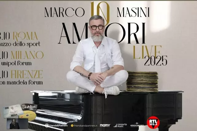 Il 2024 si conferma un anno speciale per Marco Masini: al traguardo dei 60 anni, appena compiuti, si aggiungono la pubblicazione del nuovo progetto discografico 10 Amori, in uscita il 4 ottobre, e la notizia a sorpresa di 10 Amori Live 2025, il suo atteso ritorno dal vivo nei palasport con tre date evento: il 18 ottobre 2025 al Palazzo dello Sport di Roma, il 24 ottobre all’Unipol Forum di Milano e il 25 ottobre al Nelson Mandela Forum di Firenze.