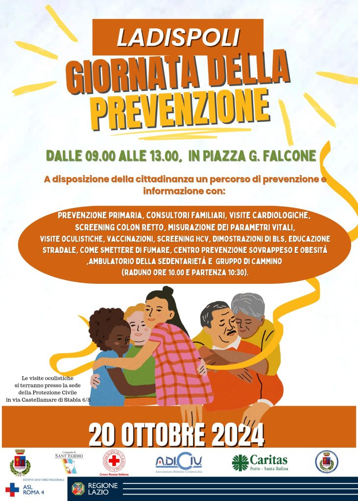 Domenica 20 ottobre dalle ore 9.00 alle ore 13.00 a piazza Falcone a Ladispoli sarà allestito un polo della salute con personale ASL Roma 4. Verranno offerti vaccini, antinfluenzale, anticovid e tutti quelli raccomandati per fascia d’età e fattori di rischio, consegna kit provette color retto per uomini e donne dai 50 ai 74 anni, screening fibrillazione atriale con ecg palmare per over 65, screening HCV, visite oculistiche per screening maculopatia e retinopatia. Le visite oculistiche si terranno nella sede della Protezione Civile a via Castellamare di Stabia 6/8. Inoltre saranno a disposizione i professionisti dei consultori familiari, quelli del Centro Antifumo, le dietiste del Centro Prevenzione Sovrappeso e Obesità, il team dell’Ambulatorio della Sedentarietà. Verranno anche eseguite dimostrazioni di tecniche BLS e il personale Dapss sarà presente per offrire misurazioni dei parametri vitali.