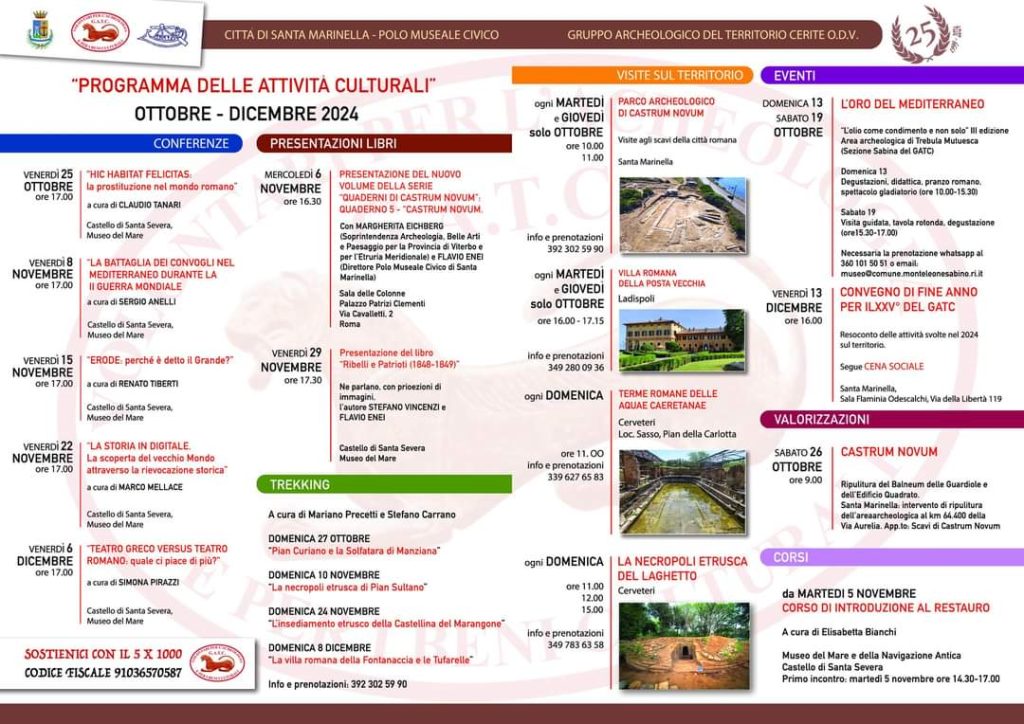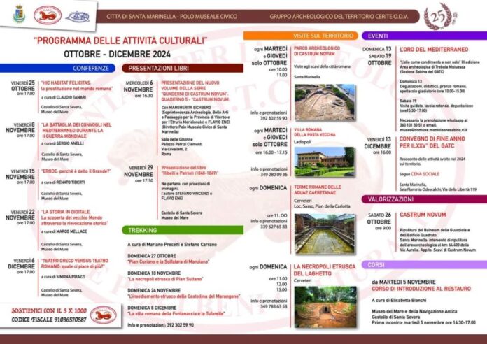 E’ stato approvato dalla Giunta Comunale, il nuovo programma culturale del Polo Museale Civico, organizzato in collaborazione con il Gatc, Gruppo Archeologico del Territorio Cerite. Una serie di iniziative che interesseranno i mesi autunnali e si svolgeranno presso il Museo del Mare al Castello di santa Severa, presso il parco archeologico di Castrum Novum e in varie location che man mano vedranno la partecipazione di esperti e amanti della storia antica del territorio. “Un calendario che si presenta ricco di appuntamenti e che sono certo testimonierà ancora una volta il grande interesse che il patrimonio storico e archeologico della nostra città sa suscitare in tantissimi cittadini e in un pubblico sempre partecipe ed attento”, ha commentato il sindaco Pietro Tidei. A presentare il programma è l’assessore alla cultura Gino Vinaccia. “La proposta autunnale prevede un nuovo ciclo di conferenze, presentazione di libri, trekking e visite ai siti del territorio- ha spiegato Vinaccia- Il primo appuntamento è per venerdì 25 ottobre alle ore 17:00 al Castello di Santa Severa, presso il Museo del Mare con la conferenza “Hic Habitat Felicitas: la prostituzione nel mondo romano”, a cura di Claudio Tanari. Seguiranno fino a dicembre altre conferenze e a novembre la presentazione del V Quaderno di Castrum Novum, presso la biblioteca A. Capotosti. Un documento che raccoglie con immagini e descrizioni accurate i ritrovamenti ricavati durante gli scavi a Castrum Novum”, ha concluso l’Assessore. “Vorrei segnalare l’iniziativa di sabato 26 ottobre curata dai volontari del Gatc, che si occuperanno della ripulitura del Balneum delle Guardiole e dell’Edificio Quadrato Santa Marinella presso l’area archeologica al km 64.400 della Via Aurelia- ha affermato la consigliera con delega ai bejni archeologici Paola Fratarcangeli-L’appuntamento è agli Scavi di Castrum Novum, alle ore 9.00. I nostri beni archeologici richiedono molta cura e un’opera di mantenimento e di conservazione continua e di questo ringraziamo i tantissimi volontari che con il loro lavoro, contribuiscono in modo rilevante”.