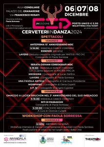 Il progetto, ideato e organizzato da Mandala Dance Company con la direzione artistica di Paola Sorressa e il patrocinio del Comune di Cerveteri (Città della Cultura Regione Lazio 2020 e 2021 e finalista Capitale della Cultura 2022), presenterà 8 produzioni a cura di Mandala Dance Company, Paola Sorressa, Gianluca Possidente, Elena Copelli, Lucas Delfino, Angelo Egarese, e un Workshop Intensivo di Danza Contemporanea in outdoor a cura di Paola Sorressa. A inaugurare la rassegna, venerdì 6 dicembre alle ore 19, la presentazione di un estratto di Essence di Mandala Dance Company, con le coreografie di Paola Sorressa che affronta la delicata questione di cosa nonostante le apparenti diversità ci lega indissolubilmente gli uni agli altri a brevi e lunghe distanze temporali e territoriali, nell’era del virtuale e delle guerre, delle pandemie e dell’emergenza climatica, del consumismo e del capitalismo. A seguire Layers, la creazione originale di Paola Sorressa per MATRIX PRO 2024, il dance training program di Mandala Dance Company: la performance esplora il concetto di stratificazioni, unicità e connessioni umane, in cui il corpo diventa un palcoscenico in cui si svelano paure, desideri, ricordi e sogni, in un continuo strato su strato di significato. Sabato 7 dicembre ore 19 la Serata Giovani Coreografi NVED, con la presentazione delle produzioni dei coreografi/e vincitori del progetto NVED_Nuovi Vettori Evolutivi Danza: Angelo Egarese con 5_PM, Elena Copelli con Morphing, Gianluca Possidente con Una favola antica e Lucas Delfino con Erosione. Quattro creazioni originali, con la partecipazione degli allievi e delle allieve di MATRIX PRO, aventi come oggetto uno o più aspetti tematiche legate alla transizioni umane, ecologiche, vibrazionali in linea con gli obiettivi e i 5 principi fondamentali dell’Agenda 2030 (le 5 P in inglese: people, planet, prosperity, peace, partnership), prodotti nell’ambito di NVED, progetto a sostegno della crescita di nuovi talenti coreografici a cura di Mandala Dance Company, che dal 2022 al 2024, ha permesso ai coreografi prodotti e associati di accedere a un’importante opportunità di sostegno produttivo. Durante la serata dedicata ai giovani coreografi NVED, verrà presentata anche la produzione Layers di Paola Sorressa. Il festival si chiude l’8 dicembre alle ore 19, con la presentazione dello spettacolo RITI DI PASSAGGIO, dedicato a Lucien Bruchon. Si ispira alla sacralità di tutti quei momenti che segnano il passaggio alle diverse fasi esistenziali o scandiscono l’evoluzione stessa dell’individuo in questa Vita terrena fino al passaggio a nuove dimensioni. Una sacra autorizzazione che permette di rovesciare l’esperienza individuale in quella collettiva e che accompagna ad una nuova condizione di equilibrio e quindi di rinascita. Chiude la giornata, alle ore 20:00 il Concerto Meditativo di Dionisia Cudalb. All’interno del progetto è previsto il Workshop Intensivo di Danza Contemporanea in outdoor per danzatori e danzatrici dal titolo Abitiamo gli spazi, con la docente/coreografa internazionale Paola Sorressa, incentrato sul mondo della Video Danza. Il percorso formativo prevede la realizzazione di videoclip nei luoghi storici della Città.
