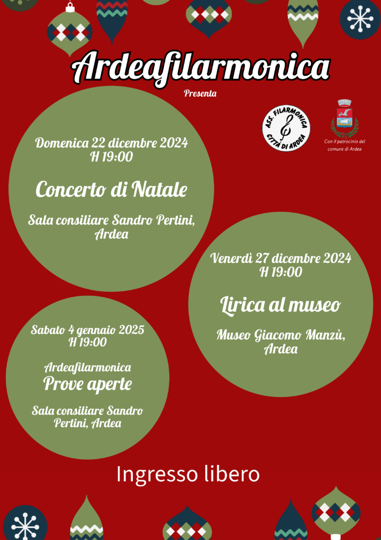 Anche durante le prossime festività non si ferma l’attività di Ardeafilarmonica, infatti sono ben tre i prossimi appuntamenti da non perdere. Domenica 22 Dicembre 2024 alle ore 19.00 presso l’Aula Consiliare “Sandro Pertini” del Comune di Ardea si terrà il tradizionale Concerto Natalizio con consueto brindisi finale. Venerdì 27 Dicembre 2024 alle ore 19.00 presso il Museo Giacomo Manzù, in collaborazione con la Direzione dei Musei Regionali del Lazio, Concerto dal titolo “Lirica al Museo” dove, dopo una visita guidata alle opere del Maestro Manzù, il Mezzosoprano Federica Fiori, il Baritono Giulio Iermini ed i pianisti Camilla Ciriaco e Pablo Ciriaco eseguiranno celebri arie d’opera, brani popolari e brani natalizi. Sabato 4 Gennaio 2025 alle ore 19.00 Ardefilarmonica aprirà il Nuovo Anno con un Concerto dal titolo “Prove Aperte” dedicato a tutti gli appassionati di musica dove il pubblico, attraverso la musica sarà condotto alla scoperta di storie, autori e brani musicali. L’obiettivo è permettere a tutti di arricchire il loro bagaglio di conoscenza rendendo partecipe il pubblico che potrà interagire con domande, osservazioni e considerazioni.