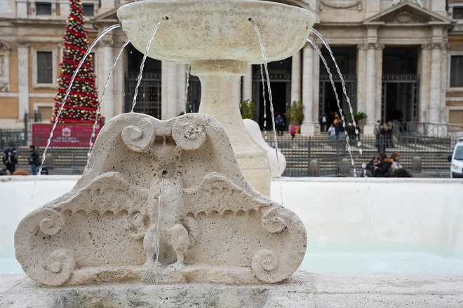 Nel 1614 Paolo V affida all’architetto Carlo Maderno la realizzazione della fontana monumentale che doveva affiancare la colonna mariana appena inaugurata, nell’ambito della campagna di lavori di sistemazione della basilica Liberiana. Interamente in travertino, la fontana si presenta oggi con una grande vasca polilobata con i lati brevi arrotondati, il bordo ampio e stondato all’interno della quale è posizionato un catino su balaustro a base ottagonale. Sui lati lunghi, rettilinei, trovano posto due vaschette semicircolari che, sostenute da mascheroni, ricevono acqua dal becco di due piccole aquile a rilievo, ognuna della quali è racchiusa in un prospetto a volute. All’interno della vasca erano, in origine, collocati sui lati brevi due grandi draghi alati dalle cui bocche zampillava l’acqua, rimossi alla fine del XVIII secolo. Alla metà del Settecento, in occasione dei lavori per la sistemazione della piazza e la costruzione della nuova facciata della basilica, si rese necessario inserire un basamento a gradini per raccordare il dislivello del terreno venutosi a creare. A partire dalla metà dell’Ottocento il grave stato conservativo della fontana richiese diversi interventi, che si ripeterono a più riprese tra la fine del secolo e lungo il secolo successivo. Gli ultimi interventi di restauro datano al 1975-1977 e, più di recente, al 1994-1995, quando fu recuperata la settecentesca gradinata e collocati i nuovi colonnotti dell’area di rispetto. Il progetto di una fontana in piazza di San Giovanni in Laterano risale agli anni del pontificato di Sisto V Peretti (1585 – 1590), in connessione agli interventi urbanistici di sistemazione della piazza con la collocazione nel 1588 dell’obelisco egizio rinvenuto nel Circo Massimo. La costruzione si deve, invece, all’iniziativa del Capitolo Lateranense a seguito della donazione da parte di papa Clemente VIII Aldobrandini (1592-1605) nel 1596 di otto once di acqua dell’Acquedotto Felice, ed è generalmente attribuita all’architetto Domenico Fontana. Collocata su una platea a tre scalini, presenta una vasca semiellittica addossata a un alto basamento. Il motivo decorativo a stelle e bande contromerlate rimanda all’emblema araldico di Clemente VIII, mentre i draghi alati e le aquile richiamano il casato di Paolo V Borghese. Il gioco d’acqua era realizzato attraverso i getti che sgorgavano dal becco dell’aquila e dalle fauci dei draghi e si raccoglievano nel catino superiore, e dai getti scaturiti dai delfini che alimentavano la vasca inferiore. Ridotta in pessime condizioni in epoca moderna, nel 1907-1908 fu oggetto di un primo restauro che ricostruì la decorazione plastica non più recuperabile. Ulteriori interventi si registrano nel 1979-1980 (in concomitanza con il restauro dell’obelisco curato dalla Soprintendenza di Stato), e tra il 1999 e il 2000, a cura della Sovrintendenza Capitolina ai Beni Culturali.