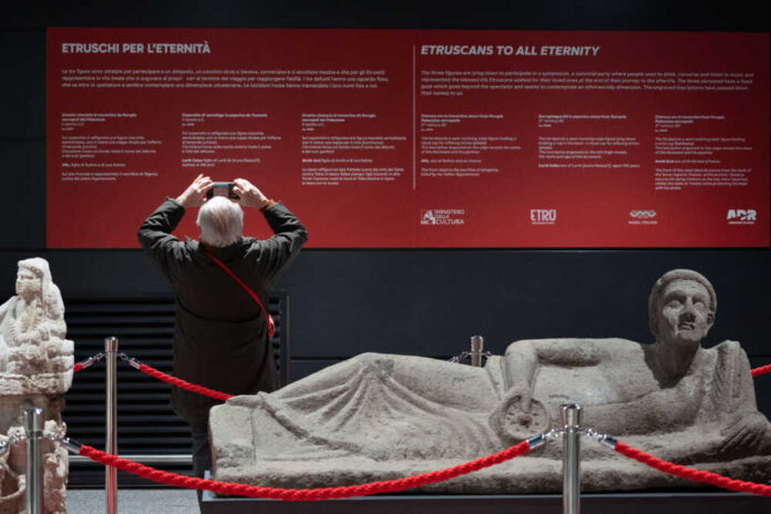 Lunedì 16 dicembre 2024 è stata inaugurata, presso l’Aeroporto di Fiumicino, l’esposizione di tre suggestive sculture etrusche appartenenti alle collezioni permanenti del Museo Nazionale Etrusco di Villa Giulia. Ad “Etruschi per l’eternità”, evento di presentazione delle tre opere che potranno essere ammirate, ogni giorno, da migliaia di passeggeri che transitano presso la zona Arrivi del Terminal 1, sono intervenuti Marco Troncone, Amministratore Delegato di Aeroporti di Roma; Luana Toniolo, Direttrice del Museo Nazionale Etrusco di Villa Giulia; Francesco Rocca, Presidente delle Regione Lazio. Grazie alla collaborazione fra Aeroporti di Roma, Direzione Generale Musei e il Museo Nazionale Etrusco di Villa Giulia, è stato possibile far “atterrare” nello scalo le opere, tra le più significative della cultura etrusca, attentamente selezionate dai curatori del Museo, per offrire al pubblico la suggestione del fascino di questo antico popolo, oltre a dare un’opportunità per programmare una visita al Museo. Si tratta di due urne cinerarie in travertino provenienti da Perugia e di un coperchio di sarcofago da Tuscania, che catturano l’attenzione grazie ai ritratti idealizzati di Laris Afle, Arnth Acsi e Larth Cales, uomini, probabilmente aristocratici, vissuti nel II secolo a.C. Tutti e tre i personaggi sono raffigurati sdraiati, mentre partecipano a un simposio: un ricevimento in cui si beveva, conversava ed ascoltava musica, un momento fondante della vita sociale degli Etruschi. Le casse delle urne sono decorate con scene del mito, dai Sette contro Tebe con Edipo che piange i figli al sacrificio di Ifigenia da parte del padre Agamennone. Gli eroi e i miti del repertorio greco, con i loro significati universali che giungono intatti fino a noi, sono scelti per riaffermare i valori su cui si fondava la comunità. Le opere, attraverso il richiamo alla dimensione reale e virtuale del viaggio, stimolano connessioni fra passato e futuro, mondo reale e fantasia, esperienze e aspettative. Un progetto di collaborazione fortemente voluto dalla direttrice del Museo Nazionale Etrusco di Villa Giulia, Luana Toniolo, che ha affermato: “Questo progetto intende portare il Museo fuori dal Museo, nei luoghi ad alta frequentazione come gli aeroporti per creare “oasi” di bellezza e per invitare a riflettere sul patrimonio culturale che appartiene ad ognuno di noi. La partnership con Aeroporti di Roma mira a far crescere sempre di più la conoscenza e la fruizione del nostro patrimonio culturale anche da parte dei viaggiatori di passaggio”. Aeroporti di Roma ha, infatti, messo da tempo in atto una strategia orientata alla valorizzazione e alla diffusione della conoscenza del patrimonio culturale, fondata su partnership con Enti, istituzioni culturali e museali, che hanno arricchito il “Leonardo da Vinci” di reperti archeologici, opere d’arte di epoche diverse e installazioni contemporanee, con l’obiettivo di ripensare i luoghi di transito promuovendo e valorizzando l’arte e la cultura in tutte le loro declinazioni. “Con la presentazione di queste tre suggestive sculture arricchiamo la proposta culturale e artistica del nostro scalo, segnando l’avvio di una collaborazione strategica con il Museo Nazionale Etrusco di villa Giulia – ha commentato l’AD di Aeroporti di Roma, Marco Troncone – “Da oggi offriamo ai nostri passeggeri e a tutta la comunità aeroportuale l’opportunità di ammirare una testimonianza concreta e di toccare con mano il valore storico della civiltà etrusca, che si è sviluppata anche nel territorio in cui il nostro scalo opera. L’intensa programmazione artistica e culturale di ADR, pilastro della nostra strategia di sviluppo sostenibile, rappresenta ormai da tempo una delle chiavi che ci ha permesso, negli ultimi anni, di trasformare l’aeroporto di Fiumicino in una formidabile vetrina delle bellezze e del patrimonio storico del nostro Paese”. “L’aeroporto è uno dei più forti simboli della modernità e primo luogo di contatto per i viaggiatori con il territorio che intendono visitare. Il fatto che questo luogo dialoghi con l’antico e diventi “vetrina” del nostro patrimonio culturale è una straordinaria opportunità. L’esposizione di preziose opere provenienti dal Museo Etrusco di Villa Giulia nell’aeroporto “Leonardo da Vinci” che si fa vero e proprio “museo diffuso”, rientra in quell’idea di promozione del Lazio che tanto ho caldeggiato sin dall’inizio del mio mandato” ha dichiarato il Presidente della Regione Lazio, Francesco Rocca.