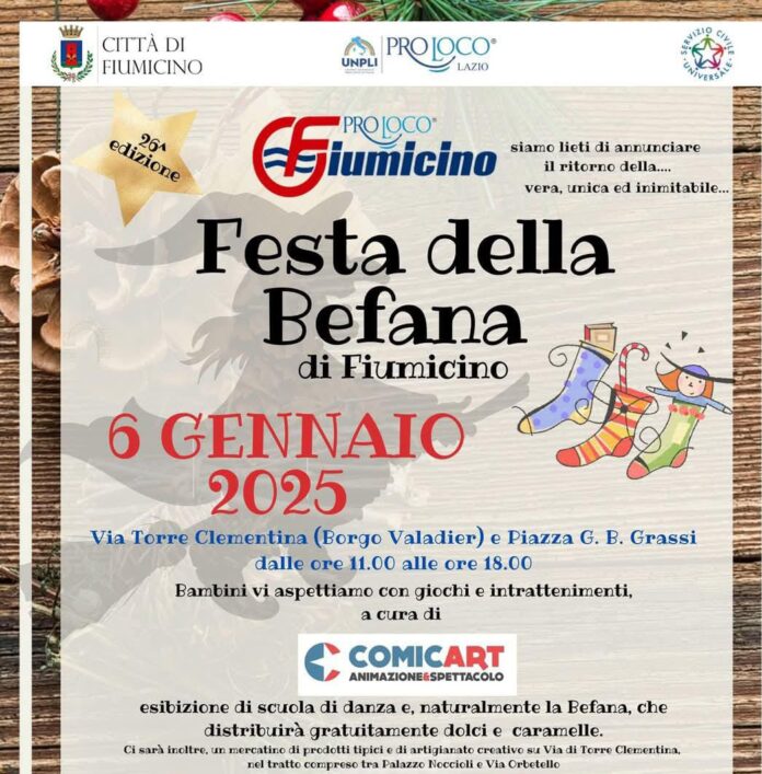 La 26^ edizione della “Festa della Befana di Fiumicino”, si svolgerà il 6 gennaio, dalle 11 alle 18, in Via della Torre Clementina e in Piazza G.B. Grassi. Sarà allestito un mercatino di prodotti tipici e di artigianato creativo in Borgo Valadier oltre. Prevista anche un’esibizione della scuola di Danza, giochi e intrattenimenti per i più piccoli e la Befana, come vuole tradizione, distribuirà dolcetti e caramella a tutti i bambini. Per permettere il regolare svolgimento della manifestazione verrà istituita la seguente disciplina traffico provvisoria per tutti i veicoli, compresi quelli muniti di speciali autorizzazioni in deroga ai divieti: – Divieto di transito veicolare e divieto di sosta con rimozione forzata, in Via Torre Clementina, nel tratto di strada compreso tra Palazzo Noccioli (Via delle Ombrine) e Via Orbetello (escluse), in entrambi i lati della carreggiata, compresi gli stalli abitualmente adibiti a parcheggio, dalle ore 07.00 alle ore 21:00 del 06 Gennaio 2025 e comunque fino al termine della manifestazione, esclusi i mezzi di soccorso/emergenza, tutti i varchi in entrata/uscita, a garanzia della pubblica incolumità, sono interdetti a mezzo transenne.