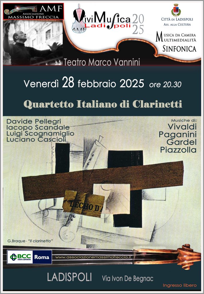 Venerdì 28 febbraio alle ore 20.30, il Teatro Marco Vannini di Ladispoli ospiterà il primo concerto della rassegna organizzata dall’AMF in collaborazione con l’Assessorato alla Cultura della città. Sul palco si esibirà il “Quartetto Italiano di Clarinetti”, una formazione recente che ha già catturato l’attenzione per la sua professionalità e vivacità. Il programma musicale del concerto spazierà da Vivaldi a Paganini, fino a Gardel, presentando originali ed accattivanti elaborazioni per questo particolare gruppo cameristico. Il Quartetto, fondato nel 2022 da Luciano Cascioli e Luigi Scognamiglio, è composto da Davide Pellegri, Iacopo Scandale, Luigi Scognamiglio e Luciano Cascioli, tutti formati al Conservatorio di Santa Cecilia di Roma. I membri del quartetto hanno ricoperto ruoli di rilievo nelle principali istituzioni bandistiche nazionali, tra cui quella dell’Esercito Italiano e dell’Arma dei Carabinieri, esibendosi anche come solisti nei più prestigiosi teatri italiani ed esteri. Questo concerto promette di essere un’esperienza musicale coinvolgente e di alta qualità, da non perdere!