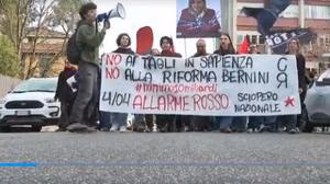In occasione della giornata nazionale dell’Università, oggi 20 marzo, gli studenti della Sapienza hanno organizzato una manifestazione per contestare il senso di questa giornata e delle politiche promosse dall’esecutivo.  “L’università dei privati, della precarietà, dei tagli al fondo per i finanziamenti ordinari, di una riforma che sta per stravolgere tutta l’università e la sua funzione.  L’università di ricatti e molestie, del caroaffitti e delle borse di studio che non arrivano, dell’emergenza in tutte le facoltà colpite dal taglio di interi corsi e insegnamenti”. Questo l’elenco delle cose che non vanno secondo Cambiare Rotta, una delle organizzazioni degli studenti universitari, che ha lanciato per il 20 marzo un “allarme rosso”. Secondo il gruppo servono almeno 10 miliardi per l’università, per la ricerca. Ad essere contestato è anche il governo della Sapienza, a partire dalla rettrice: “Torniamo a contestare chi sta mettendo le mani sull’università”, le “mani di forbice” dei tagli e la “ghigliottina della riforma”.