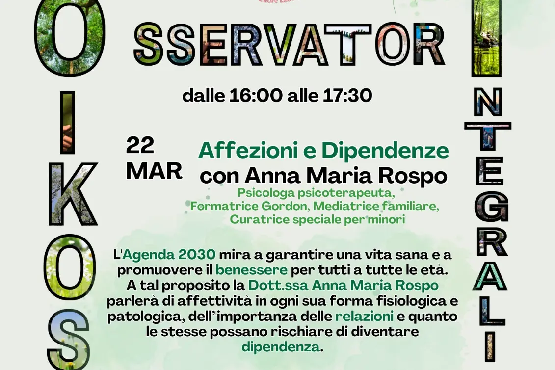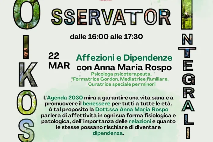 Il primo appuntamento degli “Osservatori integrali dell’Oikos”, intitolato “Affezioni e Dipendenza”, si svolgerà oggi alle 16 presso la parrocchia Sacro Cuore di Gesù in via dei Fiordalisi. Questo incontro segna l’inizio di una serie di quattro eventi dedicati agli obiettivi di sviluppo sostenibile dell’Agenda 2030. Gli organizzatori sottolineano l’importanza del benessere fisico e psicologico per tutte le età, come previsto dall’Agenda. Durante il primo incontro, il focus sarà sulle dipendenze in tutte le loro forme, comprese quelle affettive. La dottoressa Anna Maria Rospo, psicologa e psicoterapeuta con un’ampia esperienza nel trattamento di adolescenti e adulti, guiderà la discussione. La sua esperienza si concentra sull’affettività e le relazioni, analizzando come queste possano essere sia fonte di crescita che di legami disfunzionali che portano a dipendenze emotive. L’incontro rappresenta un’importante opportunità per esplorare le dinamiche delle dipendenze, comprendere i meccanismi sottostanti e riflettere su strategie per riconoscerle e affrontarle.