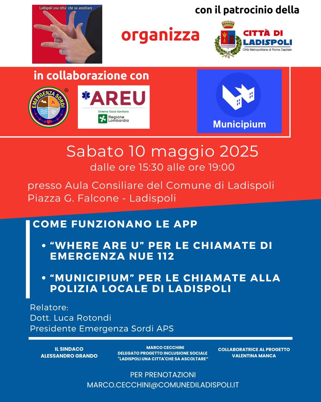 Ecco l’importante iniziativa promossa dal Comune di Ladispoli per migliorare l’accessibilità e l’inclusione delle persone sorde durante le emergenze. Con parole di Marco Cecchini, delegato del sindaco, si sottolinea che “la sicurezza è un diritto, non un privilegio”. L’evento, previsto per sabato 10 maggio nell’Aula Consiliare, presenterà due strumenti tecnologici fondamentali: