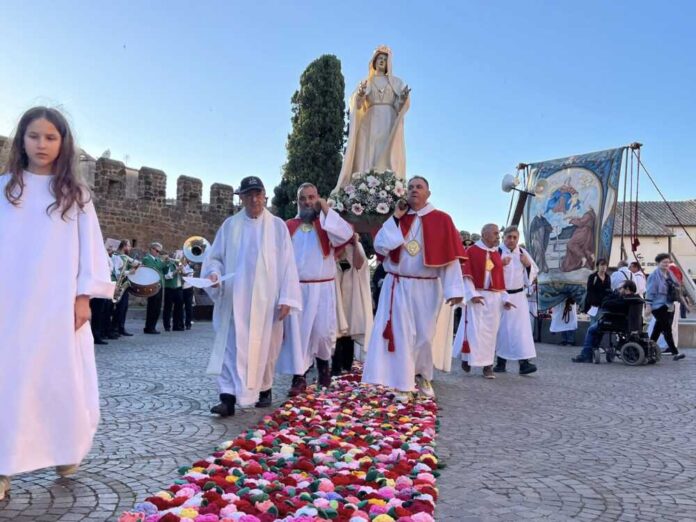 L’Infiorata di Cerveteri, una tradizione radicata e sentita dalla comunità. Questa manifestazione, dedicata alla Madonna della Parrocchia Santa Maria Maggiore, rappresenta un momento di forte devozione e unione tra i cittadini. Dopo la Santa Messa nel Centro Storico, vengono realizzati disegni e opere floreali dai concittadini, che accompagnano la processione della statua della Madonna Addolorata, una delle poche “Madonne vestite” sopravvissute alle iconoclaste furie napoleoniche, testimoniando secoli di fede e storia locale. Particolarmente significativa è l’omaggio floreale delle Signore della APS Mai Soli, con una rete di 8 metri decorata con 3.000 rose cucite a mano, simbolo di devozione e bellezza. La giornata è resa ancora più speciale dalla musica del Gruppo Bandistico Cerite, che arricchisce con le sue note questo momento di festa e spiritualità. Il messaggio finale esprime gratitudine e apprezzamento a tutti i cittadini, alle Confraternite e a coloro che hanno contribuito alla realizzazione di questa meravigliosa tradizione, sottolineando l’importanza del senso di comunità e di fede che questa manifestazione rappresenta per Cerveteri.