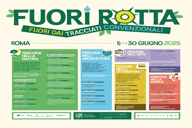 Fuori/Rotta, fino al 30 giugno, trasformerà il Municipio IV e la Valle dell’Aniene in un avventuroso itinerario urbano, fatto di scoperte lente e coinvolgenti attraverso ventidue appuntamenti gratuiti. In programma ci sono cinque modalità di esplorazione, pensate per risvegliare lo sguardo e il senso di meraviglia. I percorsi di Fuori/Rotta: percorsi nella natura tra trekking, rafting e uscite in bicicletta lungo i sentieri fluviali, accompagnati dalle guide ambientali e dagli esperti di paesaggio; percorsi nell’architettura, passeggiate urbane che, sulle orme di poeti e artisti del passato, sveleranno la memoria storica e la bellezza nascosta dei quartieri del Municipio IV; percorsi in musica, con due concerti fra sacro, popolare e world music che uniscono culture diverse in nuove armonie di comunità in scena alla Casa del Municipio IV “Ipazia di Alessandria”; percorsi nella letteratura alla Biblioteca Vaccheria Nardi, palcoscenico di un ciclo di quattro incontri dedicati ai grandi autori e autrici che hanno raccontato una Roma poco frequentata. Infine i percorsi nell’arte, con un’installazione di poesie in musica e una mostra fotografica, uno sguardo originale sul corso dell’Aniene dentro le pieghe della capitale. Fuori/Rotta è un invito a perdersi e ritrovarsi, esplorando luoghi e narrazioni che spesso ignoriamo con l’obiettivo di promuovere pratiche di ascolto, relazione e sostenibilità e di valorizzare il territorio come spazio di esperienza artistica e consapevolezza ecologica.