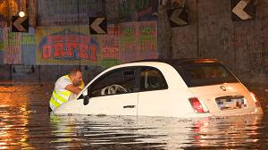 Allagamenti a Roma, soccorritore rimuove auto bloccata in sottopasso