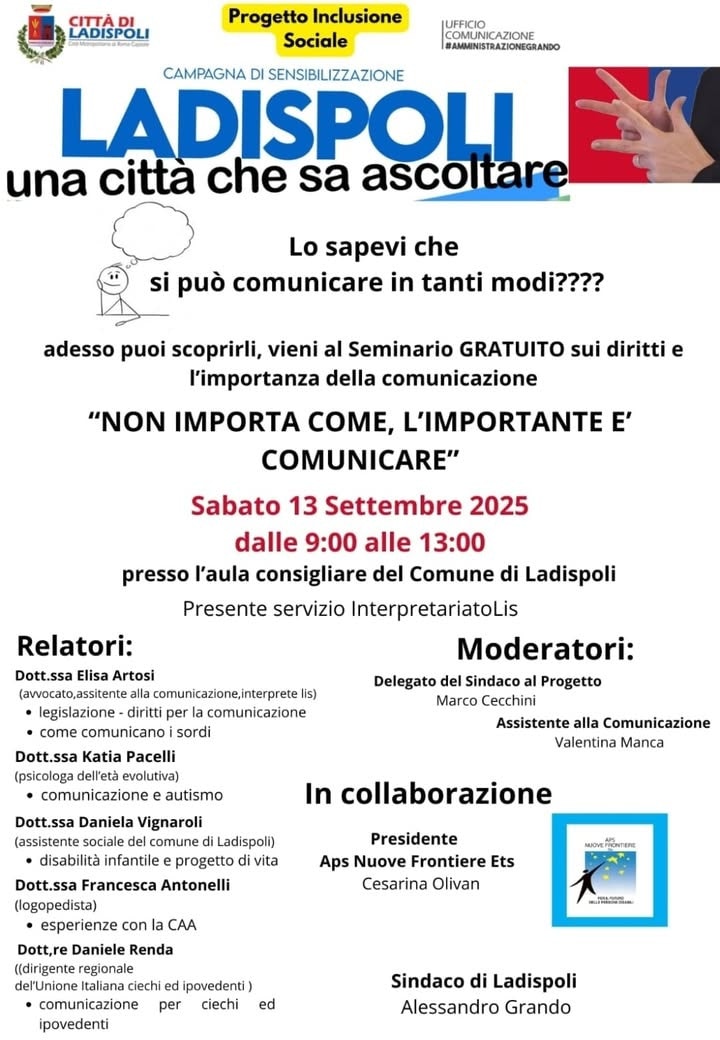 Un appuntamento dedicato all’ascolto e al dialogo con la cittadinanza. Si terrà sabato 13 settembre alle ore 9, presso la sala consiliare di Piazza Falcone, il seminario gratuito dal titolo “Non importa come, l’importante è comunicare”, promosso dal Comune di Ladispoli e annunciato attraverso il profilo Facebook istituzionale. L’incontro rientra nel progetto di inclusione sociale “Ladispoli Città che sta ad ascoltare”, un’iniziativa pensata per favorire il confronto tra amministrazione e comunità, dando voce a tutte le fasce di popolazione, comprese quelle più fragili. In prima linea per l’organizzazione il delegato del Sindaco Marco Cecchini, affiancato dalla collaboratrice Valentina Manca, dal team di lavoro comunale e con il supporto dell’Associazione APS Nuove Frontiere. «L’obiettivo – spiegano i promotori – è creare uno spazio di condivisione aperto, in cui l’importanza della comunicazione sia al centro, indipendentemente dal mezzo o dalla modalità. Vogliamo costruire una città più attenta ai bisogni di tutti, partendo dall’ascolto». Il seminario è aperto a tutta la cittadinanza e rappresenta un’occasione per riflettere sull’importanza del dialogo, della partecipazione e di un’amministrazione sempre più vicina ai cittadini.