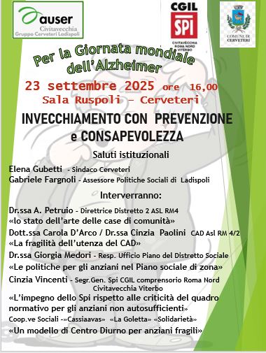 “La popolazione anziana fragile e i suoi bisogni”, in programma venerdì 23 settembre alle ore 16.00 presso la Sala Ruspoli di Cerveteri. L’incontro sarà l’occasione per analizzare dati, ascoltare testimonianze e confrontarsi su politiche attive per la terza età, dalla sanità territoriale al sostegno domiciliare, fino ai servizi di socializzazione e prevenzione della solitudine. «Dobbiamo prepararci oggi a rispondere ai bisogni di domani – sottolineano gli organizzatori –. L’aumento della popolazione anziana fragile non è solo un problema sanitario, ma una sfida sociale che riguarda tutta la comunità. Servono strategie condivise, reti di supporto e una maggiore integrazione tra istituzioni, associazioni e cittadini». Il convegno si inserisce in un contesto in cui l’invecchiamento attivo e la cura delle fragilità stanno diventando elementi centrali nelle agende locali. Un’occasione importante, dunque, per avviare un percorso partecipato che metta al centro dignità, salute e qualità della vita nella terza età.